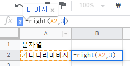 여기서 마지막에 있는 "마바사"를 가져오려면 어떻게 해야할까요?RIGHT 함수는 문자열에서 맨뒤부터 특정 갯수를 가져와야 하는 경우 사용하는 함수입니다.