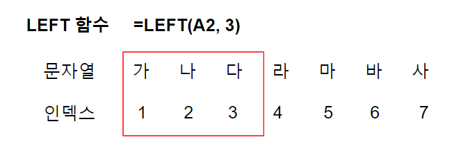 아래 예시에서는 `A2문자열에서 첫번째 문자부터 3개를 가져와라` 입니다.