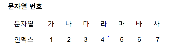 이 문자열에는 고유 번호가 있습니다. 프로그래밍하는 언어마다 0부터 시작하는 경우도 있고 1부터 시작하는 경우도 있자만 스프레드시트는 문자열이 1부터 시작합니다.