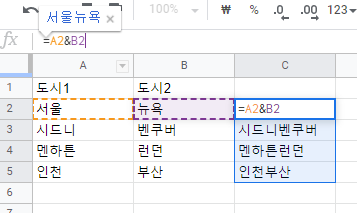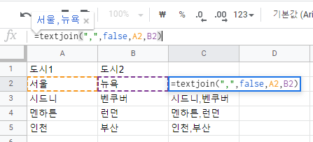 스프레드 시트 TEXTJOIN 함수 예시 =textjoin(",",false,A2,B2) ",": 구분자 false: 공백 포함여부 -> false니 공백포함안함 A2: 문자열1 B2: 문자열23. & 연산자