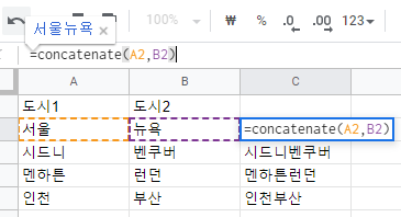 함수/연산자 기능 문법 concatenate 두개이상의 문자열을 합쳐줌 support.google.com/docs/answer/3094123?hl=ko textjoin 두개이상의 문자열을 구분자와 함께 합쳐줌 support.google.com/docs/answer/7013992?hl=ko & 두개이상의 문자열을 합쳐줌 kbkb456.tistory.com/6 1. CONCATENATE