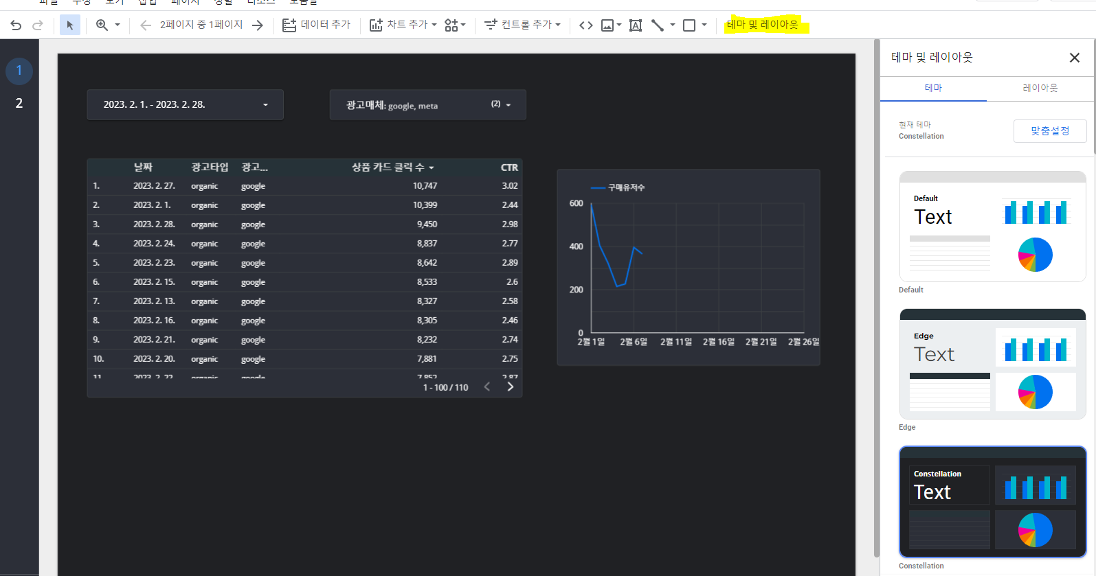 상단에서 테마 및 레이아웃을 고르면 전체적인 분석 레포트의 톤을 정할 수 있다.