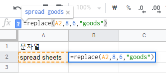 스프레드 시트 replace 예제 1 이경우 spread sheets에서 sheets를 goods로 바꿔야 하는 예제인데요.