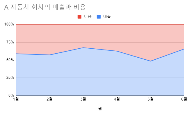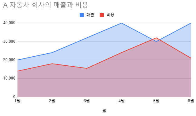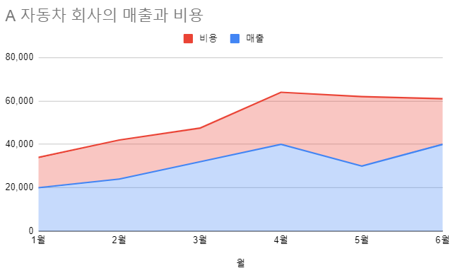 구글 스프레드 시트 누적영역차트 비용과 매출을 합산하여 표시하되 각각 항목별로 얼마나 면적을 차지하는지 알려줍니다.