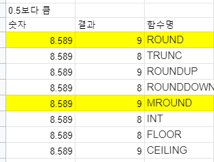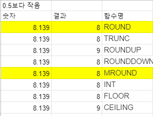 함수명 기능 ROUND 표준 규칙에 따라 숫자를 특정 소수점 이하 자릿수로 반올림 TRUNC 특정 개수의 자릿수만 남기고 나머지 자리를 잘라 버립니다. ROUNDUP 숫자를 특정 소수점 이하 자릿수로 올립니다. ROUNDDOWN 숫자를 특정 소수점 이하 자릿수로 버립니다. MROUND 한 숫자를 다른 숫자의 가장 가까운 정수배로 반올림합니다. INT 해당 숫자보다 작거나 같은 가장 가까운 정수로 숫자를 버립니다. FLOOR 숫자를 지정된 significance의 가장 가까운 정수배로 버립니다. CEILING 숫자를 지정된 significance의 가장 가까운 정수배로 올립니다.