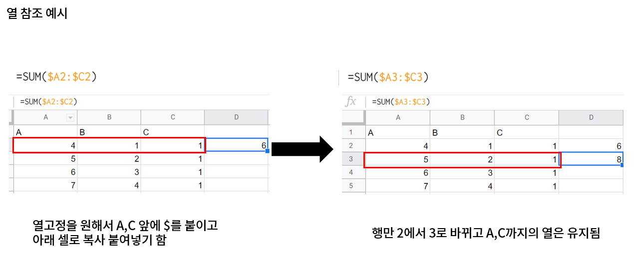 $A2:$C2로 걸었을때 아래로 복사하니 $A3:$C3로 행만 바뀌어서 연산됨