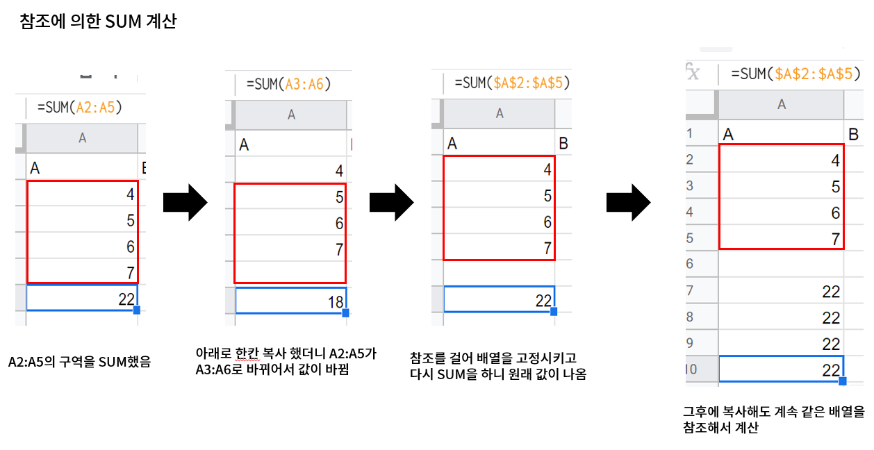 쉽게 말해 해당 행, 열 혹은 배열을 고정 시켜놓고 계산 하겠다는 것 입니다.