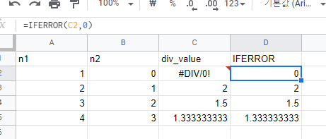 이런 경우 오류값을 0으로 처리한다고 합시다. 이럴때는 IFERROR함수를 통해서 간단하게 처리할 수 있습니다.