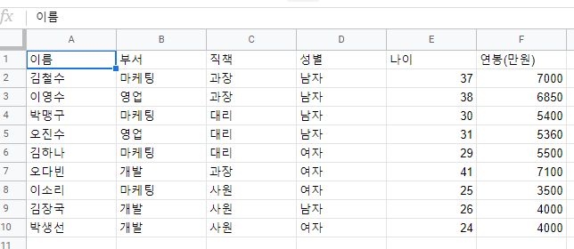 =if(관련 조건식, 참일때 값 , 거짓일때 값) ex) =if(A1 = B1, 1, 0) A1과 B1이 같다면 1 서로 다르다면 0예를들어 이런 연봉 테이블에 대한 데이터가 있다고 가정을 해봅시다.